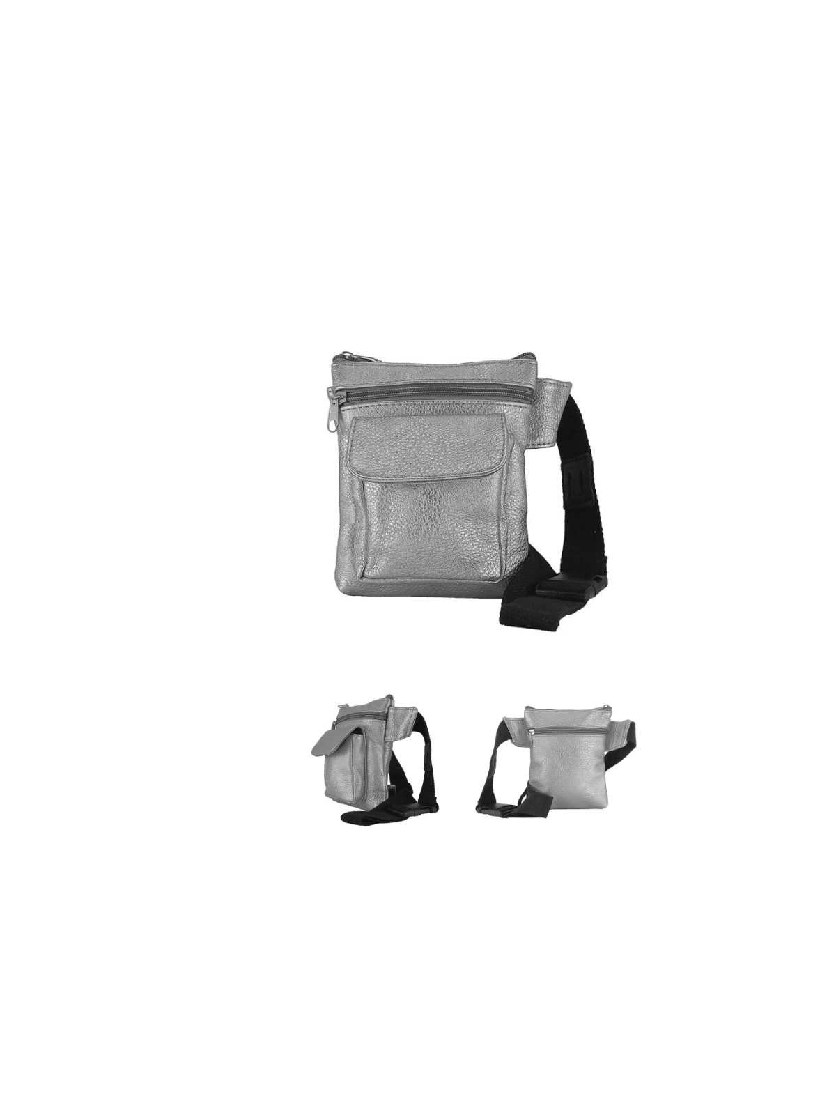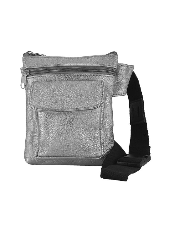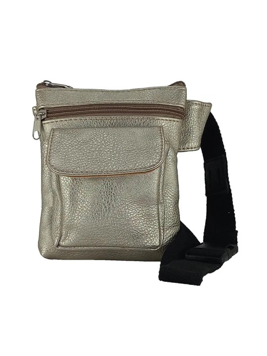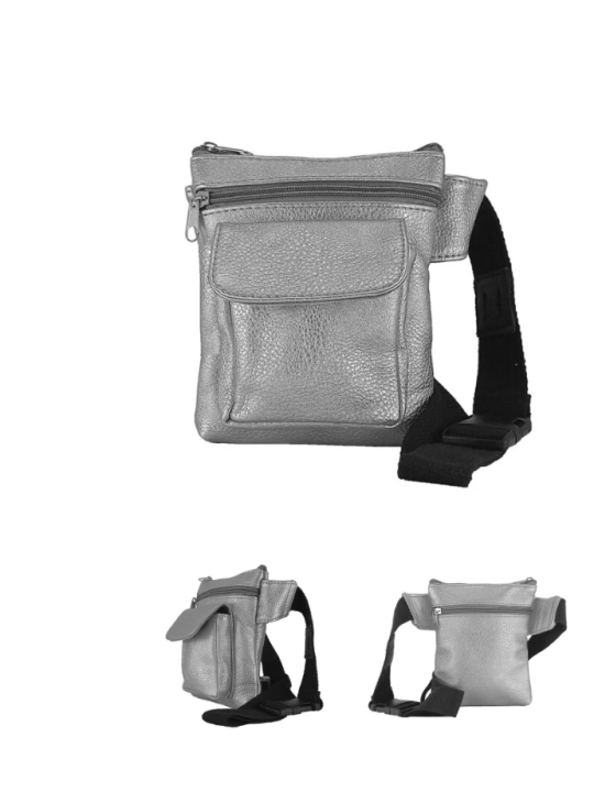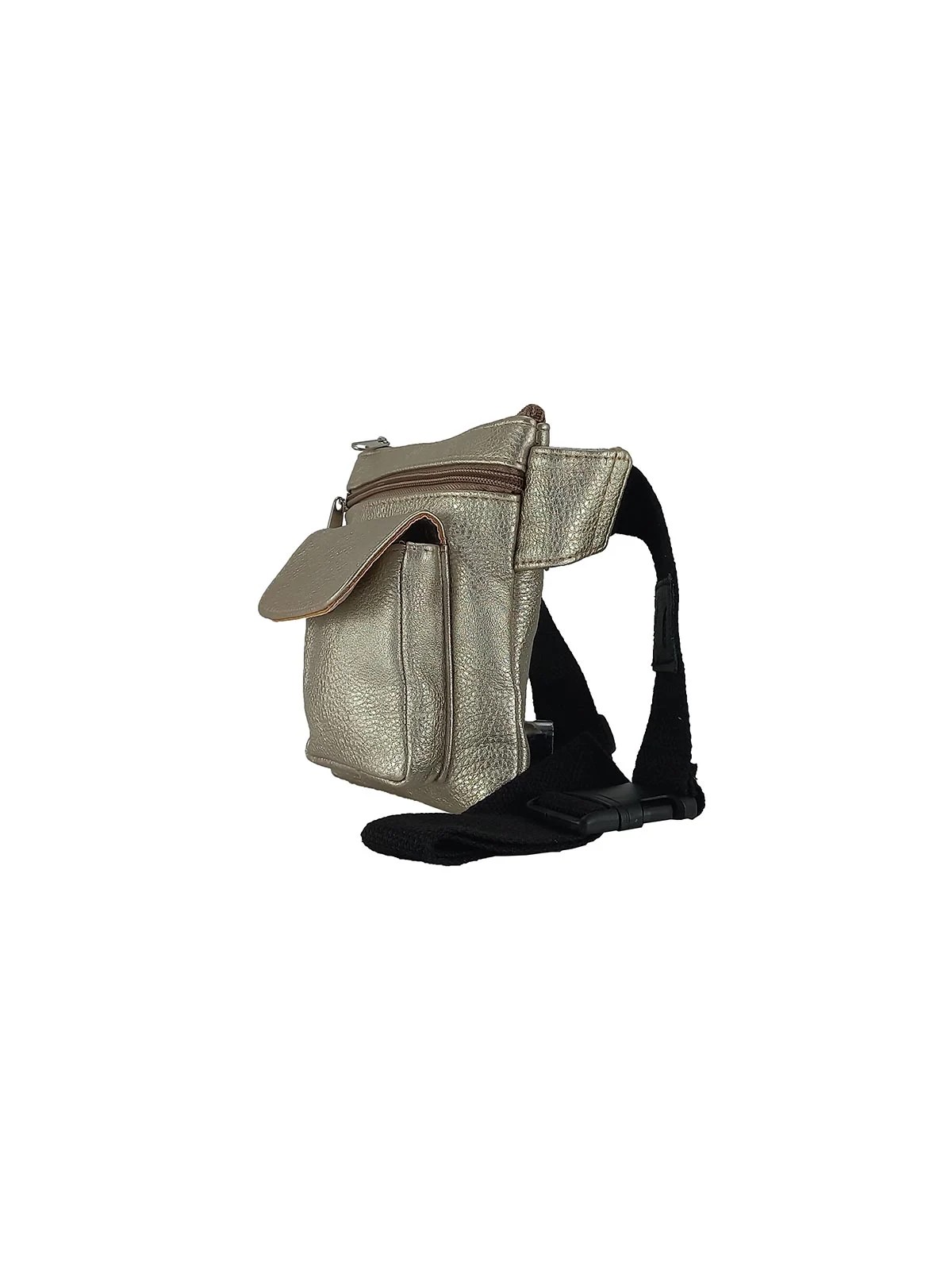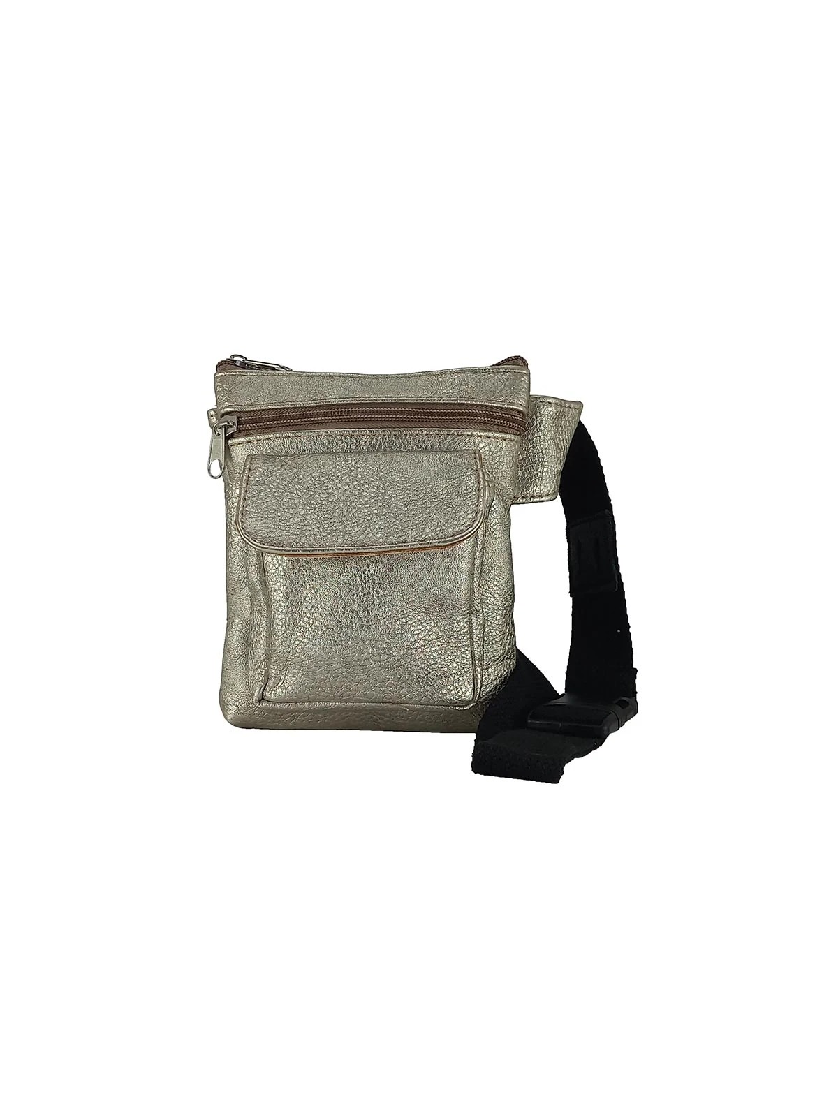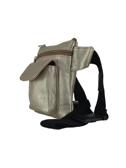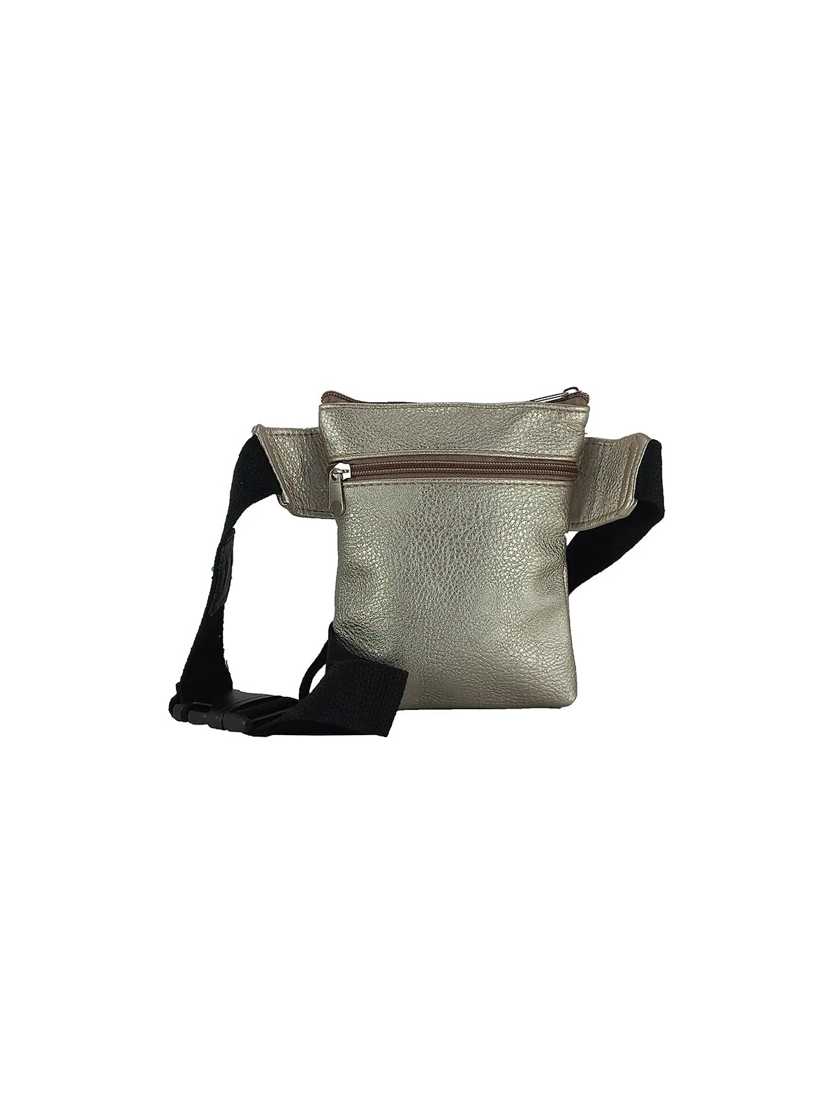 Riñonera bandolera en polipiel. Cierre con cremallera. Bolsillo trasero con cremallera. Bolsillo frontal con cremallera y otro bolsillo frontal con solapa y cierre de imán. Portagafas en la correa. Correa extensible de 85 a 130cm.