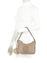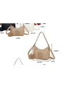 Exterior: Bolsillo trasero con cierre de cremallera. Borla a juego y bandolera cruzada.