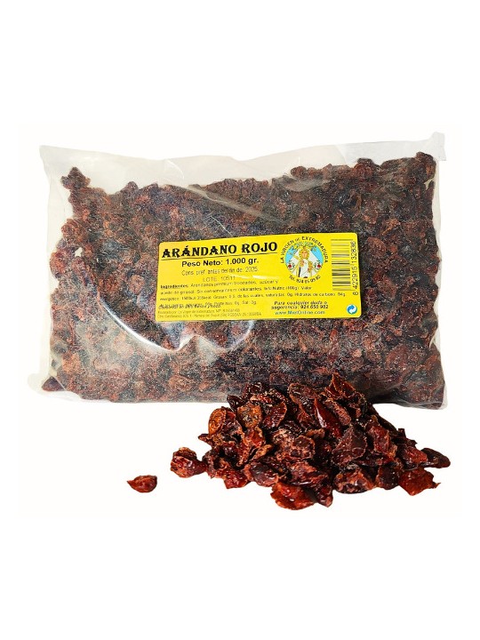 El arándano rojo es una fruta de la que no sólo los humanos somos golosos, sino también diferentes tipos de animales. El nombre en inglés del arándano rojo muy difundido en el mundo es, de hecho, cowberry, que se puede traducir como “baya de vaca”, precisamente porque también lo consume el ganado. La ingesta continua de arándano se acepta como un preventivo de las infecciones del tracto urinario, principalmente en mujeres y pacientes con cateterismos continuos. Los estudios clínicos aceptan que el ácido hipúrico y la proantocianidina reducen la capacidad de la E. coli para adherirse al urotelio vesical, por tal razón se recomienda su consumo diario sea fresco o deshidratado. SIN COLORANTES, NI CONSERVANTES.