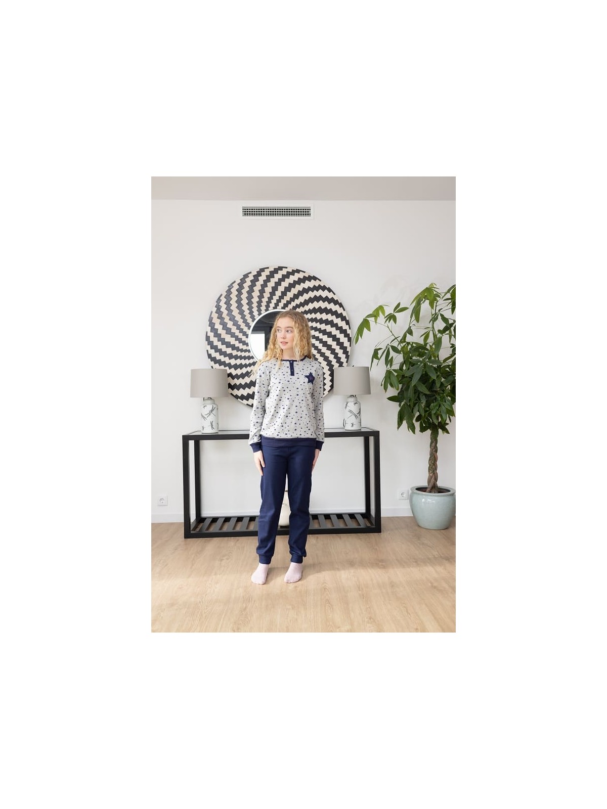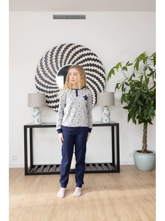 Pijama de niña largo 2 piezas color marino de estrellas con tejido en punto de algodón suave y muy agradable con terminación de puños en las dos piezas.Modelo de la marca española Blanca Hernández B&H en tallas 10 a 16. Ideas para regalar este invierno o darte un capricho.