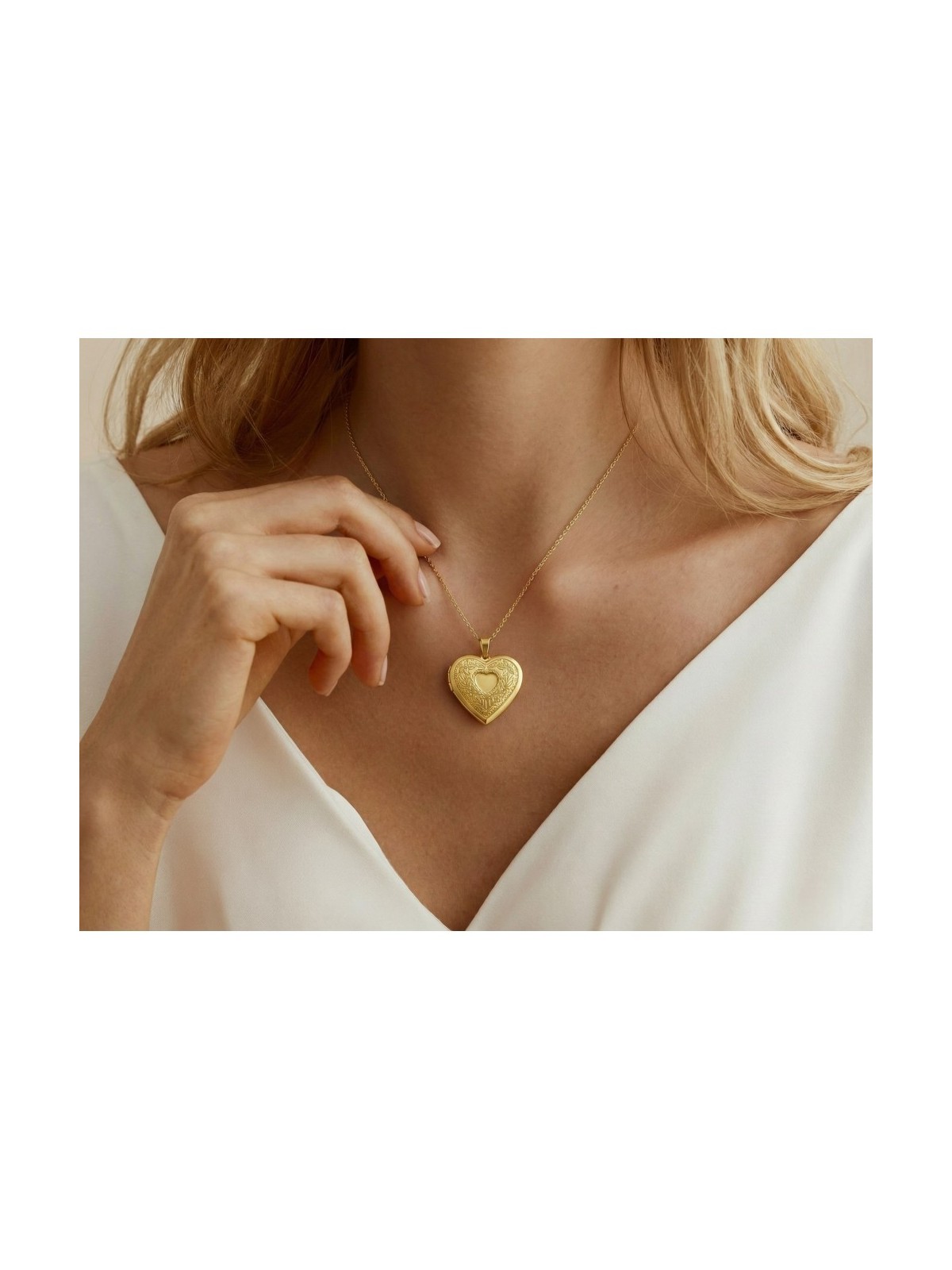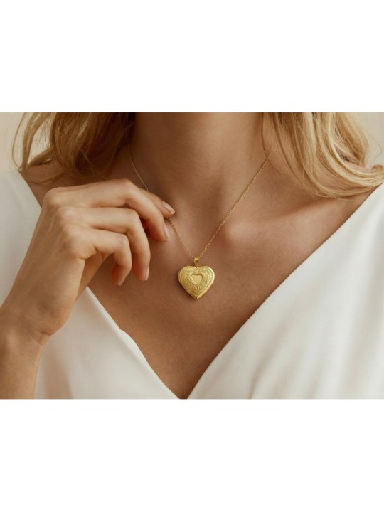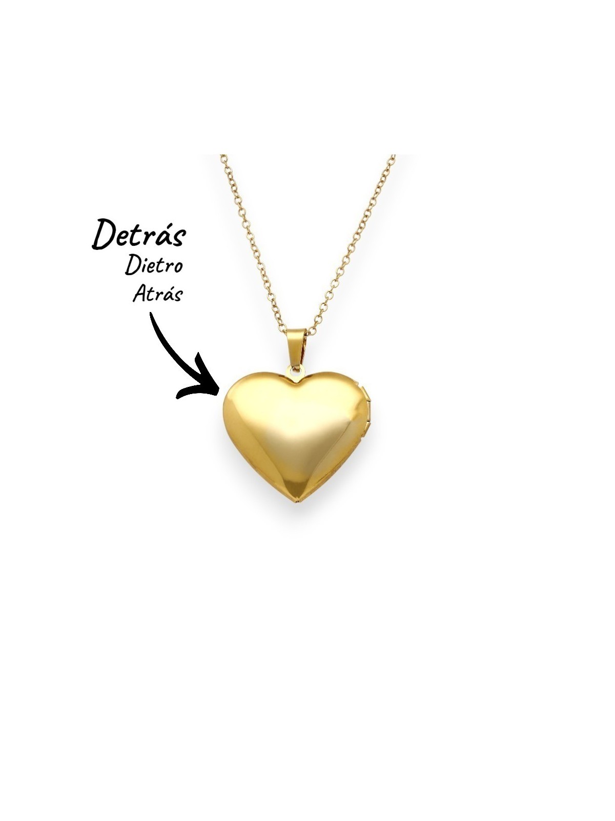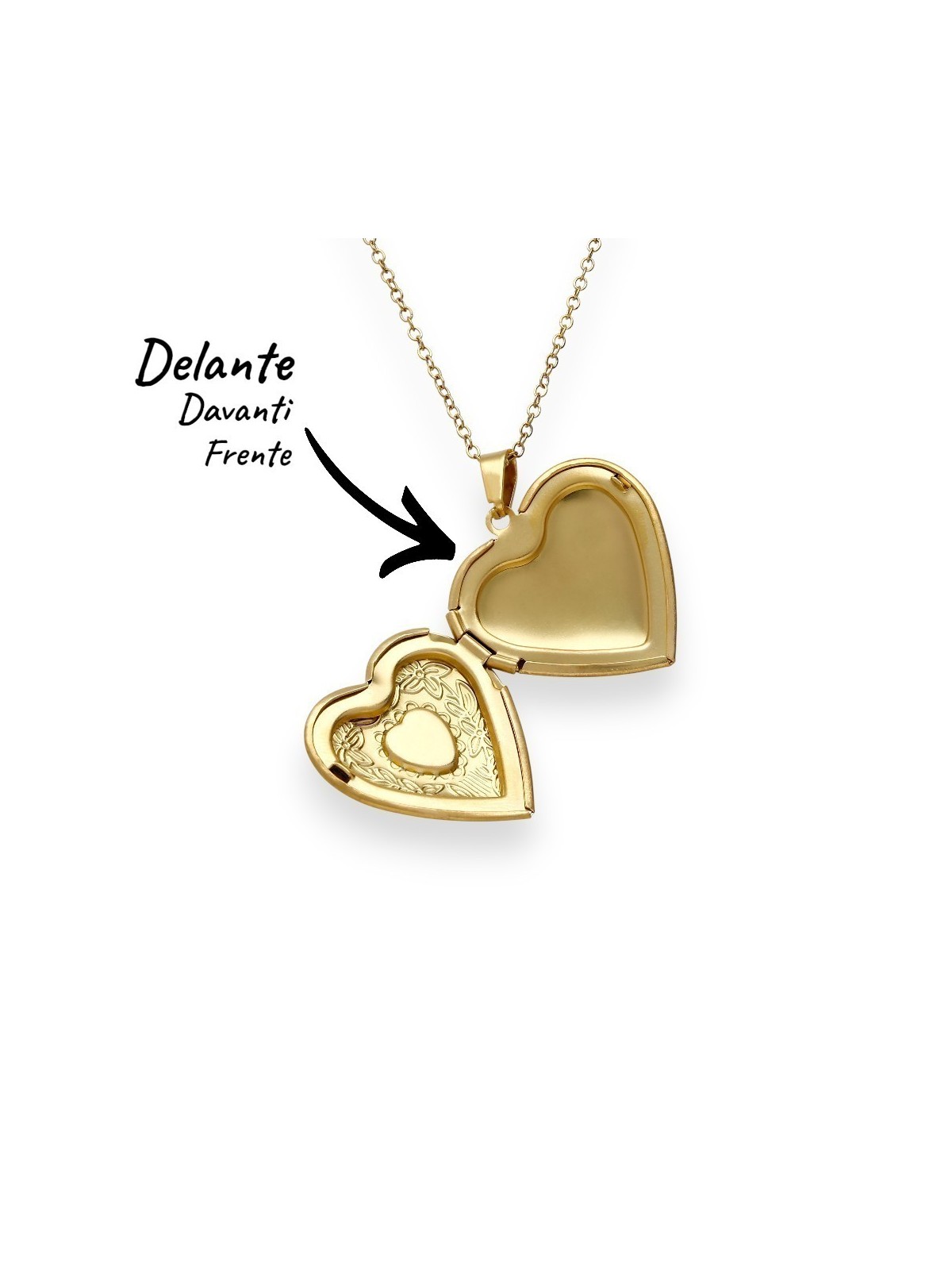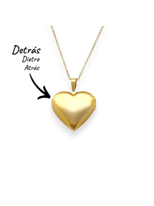 Collar Corazón Eternal Love en acero inoxidable 316 L con elegante chapado en oro de 18 quilates; joya personalizable de alta joyería en forma de corazón relicario con apertura mediante bisagra; su interior permite guardar una foto o grabar un texto con valor sentimental; la tapa frontal exterior puede personalizarse con una inicial, corazón o símbolo infinito; la parte trasera lisa y brillante admite grabado de texto o símbolo; diseño cargado de significado que simboliza amor eterno, protección y recuerdos imborrables; Medidas corazón 27 x 29 x 7 mm con gran presencia; cadena ajustable de 45 a 50 cm y cierre mosquetón seguro.