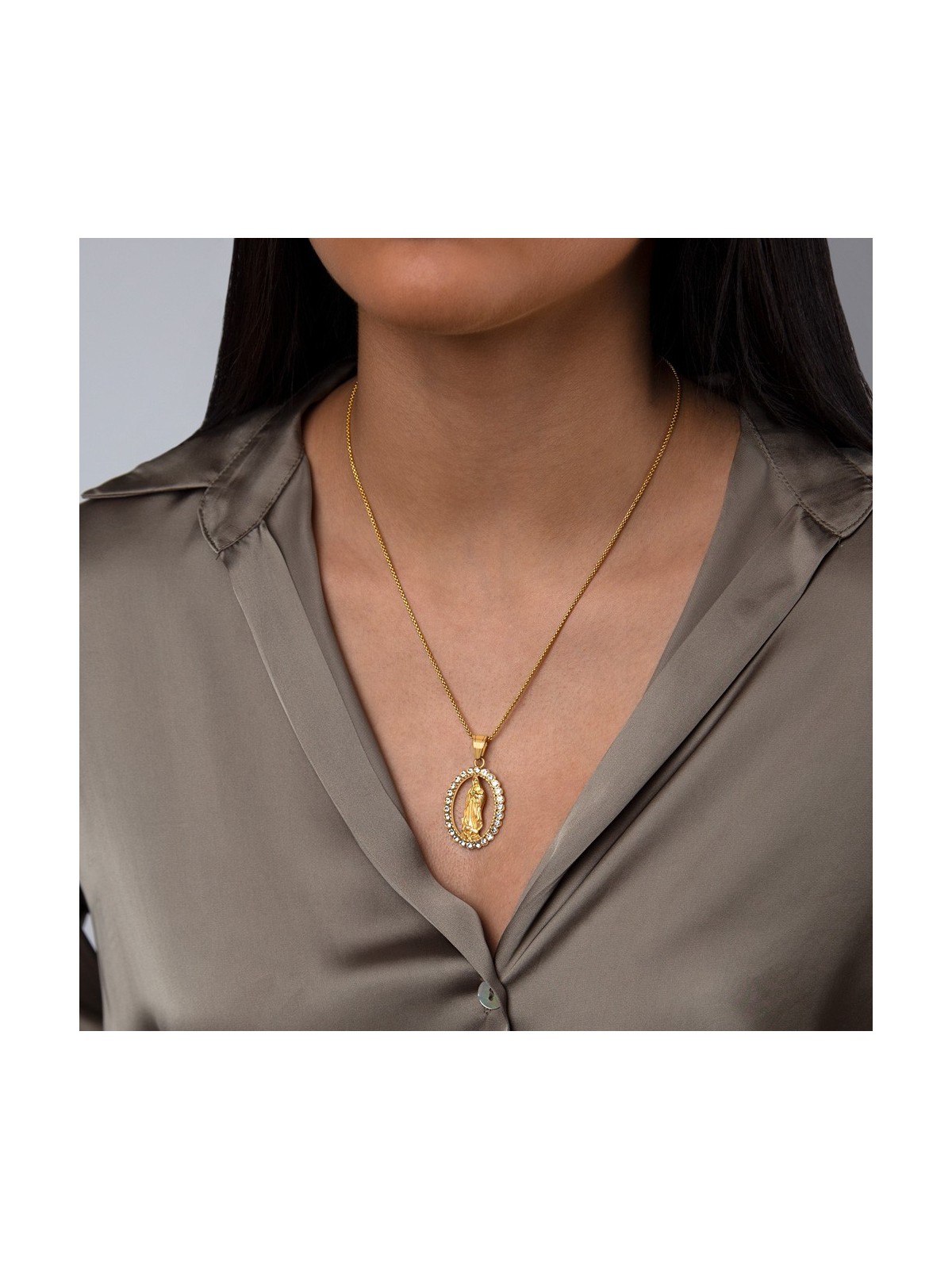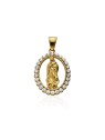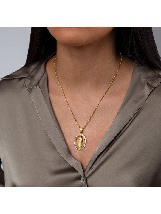 Medalla Virgen María en acero inoxidable 316 L con elegante chapado en oro de 18 quilates; joya religiosa de alta calidad engastada con una orla completa de circonitas cúbicas que aporta brillo y distinción; la Virgen María simboliza fe, protección y amor maternal; diseño refinado de joyería fina con medidas de 35 x 25 mm de gran presencia; pieza hipoalergénica y resistente ideal para uso diario o ceremonial; medalla devocional perfecta como regalo significativo.
