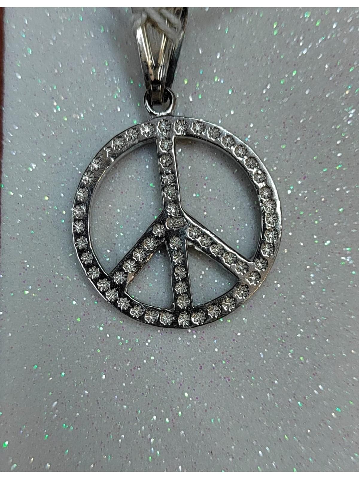Símbolo de la paz con incrustaciones de piedras de onix ,vista delantera y vista trasera .