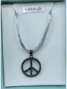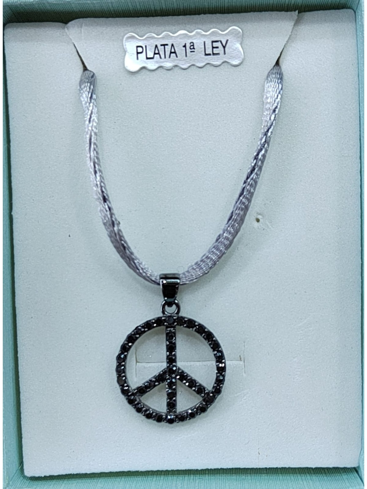 Colgante de plata bañada en rutenio,el símbolo de la paz con circonitas de color negro y cordón de seda gris,mide 2cm de diametro.