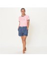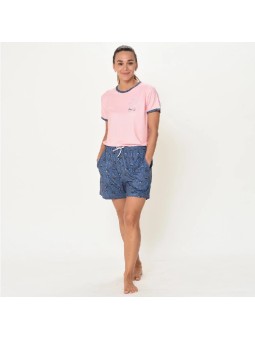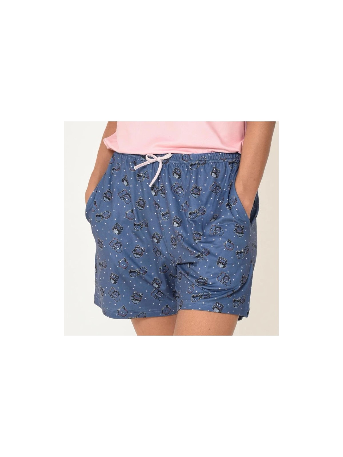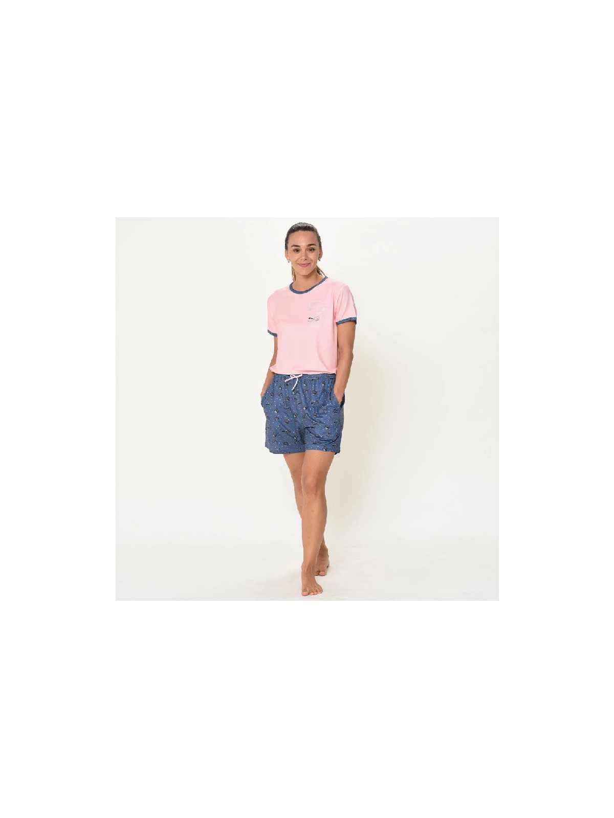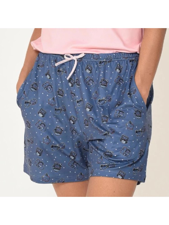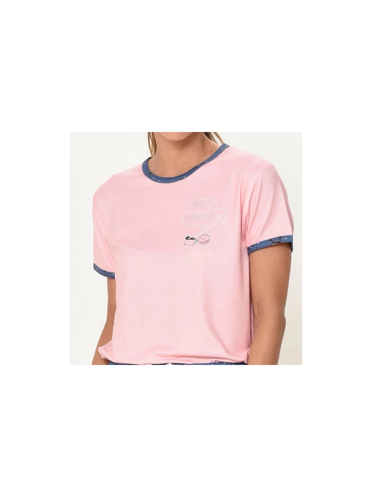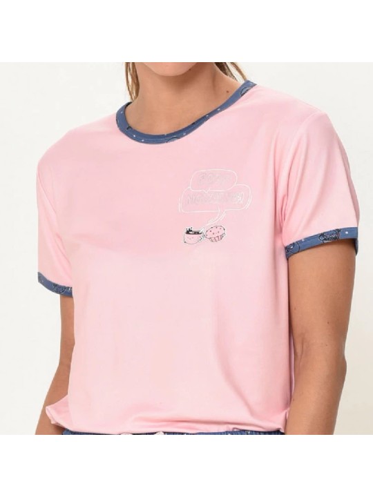 Pijama de manga corta y pantalón corto cuenta con una camiseta de color rosa con un pequeño dibujo de una taza de café y una magdalena en la parte izquierda, lo que le añade un toque de dulzura al diseño. El pantalón corto, en color azul, está estampado con los mismos motivos que la camiseta, creando una combinación armoniosa. La cintura del pantalón está decorada con un pequeño lazo rosa, que hace juego con el color de la camiseta. Además, el ribeteado del cuello y las mangas de la camiseta coincide con el estampado del pantalón, lo que brinda un acabado cuidado y coordinado a este conjunto de pijama.